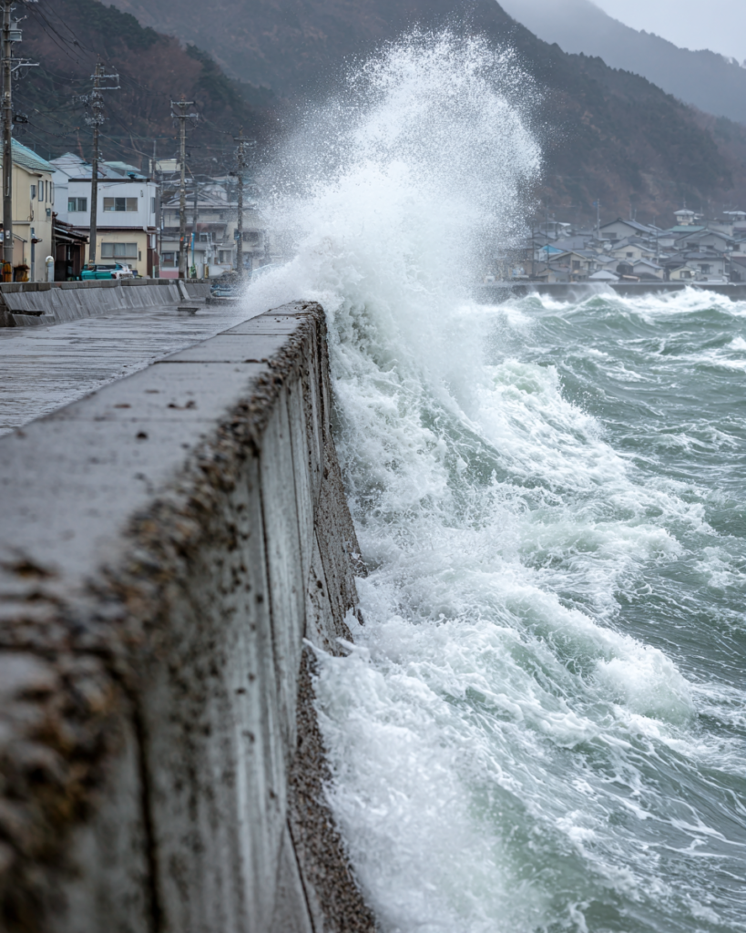 - وصول أول موجة تسونامي (ارتفاع 68 سم) دون أضرار كبيرة بفضل الجدران البحرية.