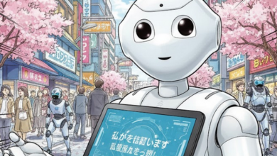 لقاء الإنسان مع ذاته في عيون روبوت تقنية يابانية وإبداعات سوفتبانك softbank في صباح هادئ بمدرسة ابتدائية في طوكيو، وقف…